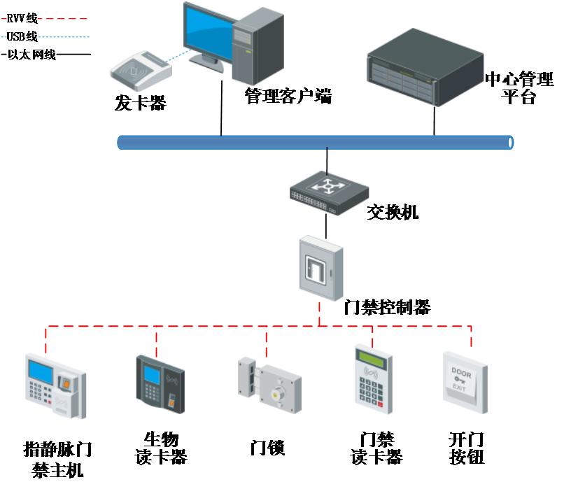 門禁讀卡器、生物識(shí)別讀卡器、開門按鈕、磁力鎖等前端門禁設(shè)備通過RVV4*0.75/ RVV2*0.75線纜接入到網(wǎng)絡(luò)門禁控制器上,而網(wǎng)絡(luò)門禁控制器通過非屏蔽雙絞線接入交換機(jī)經(jīng)局域網(wǎng)集成到安防綜合管理平臺(tái)上。